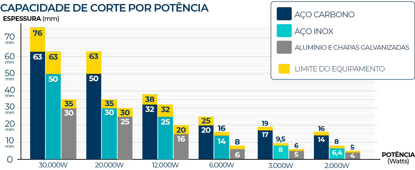 De acordo a necessidade de corte do cliente a máquina de corte a laser Weld Vision possui opções de fonte de 2000W, 3000W, 6000W, 12.000W, 20.000W e 30.000W.