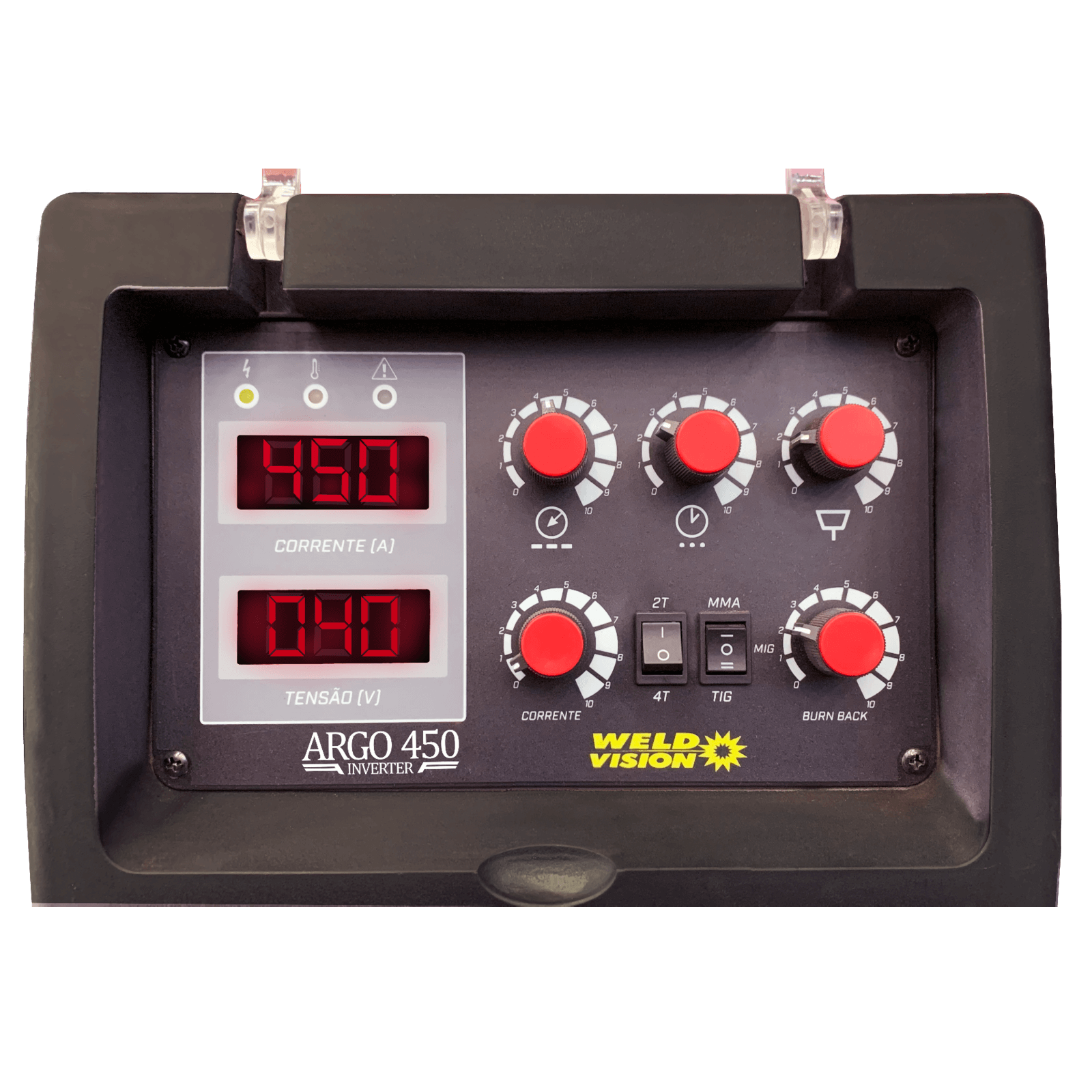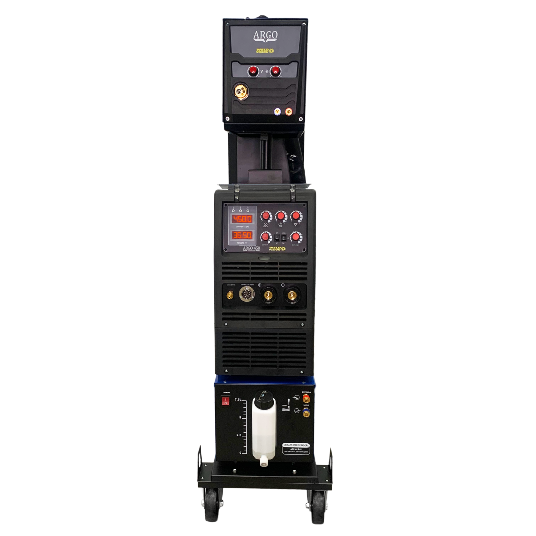 A Argo Inverter 450 possui a função 4T, que permite ao soldador acionar a tocha com apenas um clique, obtendo assim maior liberdade e mobilidade na execução do serviço.